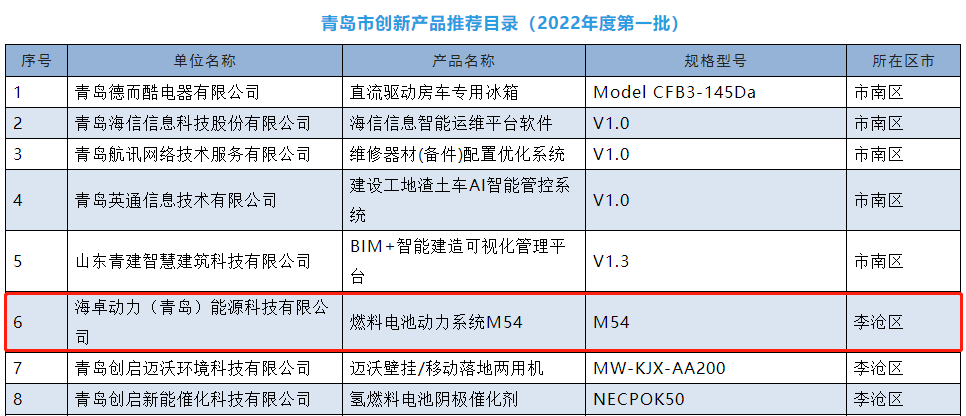 近期,青岛市工业和信息化局发布了《青岛市创新产品推荐目录(2022年度第一批)》名单,凯发K8旗舰科技自主研发的卓氢H6燃料电池系统平台中的M54产品成功入选。《青岛市创新产品推荐目录》编制工作由青岛市工业和信息化局组织召开,旨在鼓励支持企业研发新产品、新技术、新工艺,加大创新产品推广应用力度,促进创新产品的市场化和产业化。