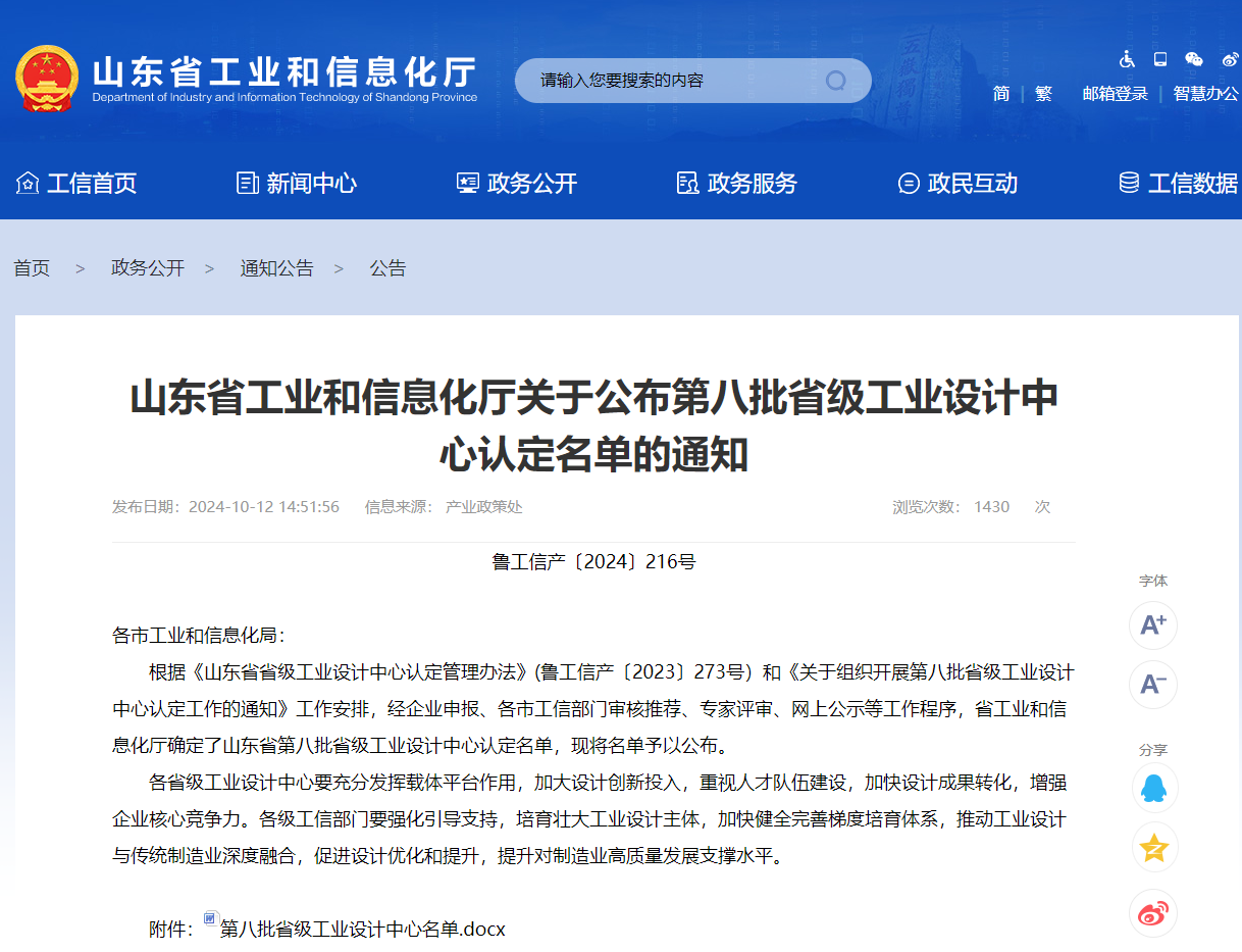 近期,山东省工业和信息化厅公布了第八批省级工业设计中心认定名单。经企业申报、各市工信部门审核推荐、专家评审、网上公示等程序,凯发K8旗舰科技成功取得“省级工业设计中心”资质认定。